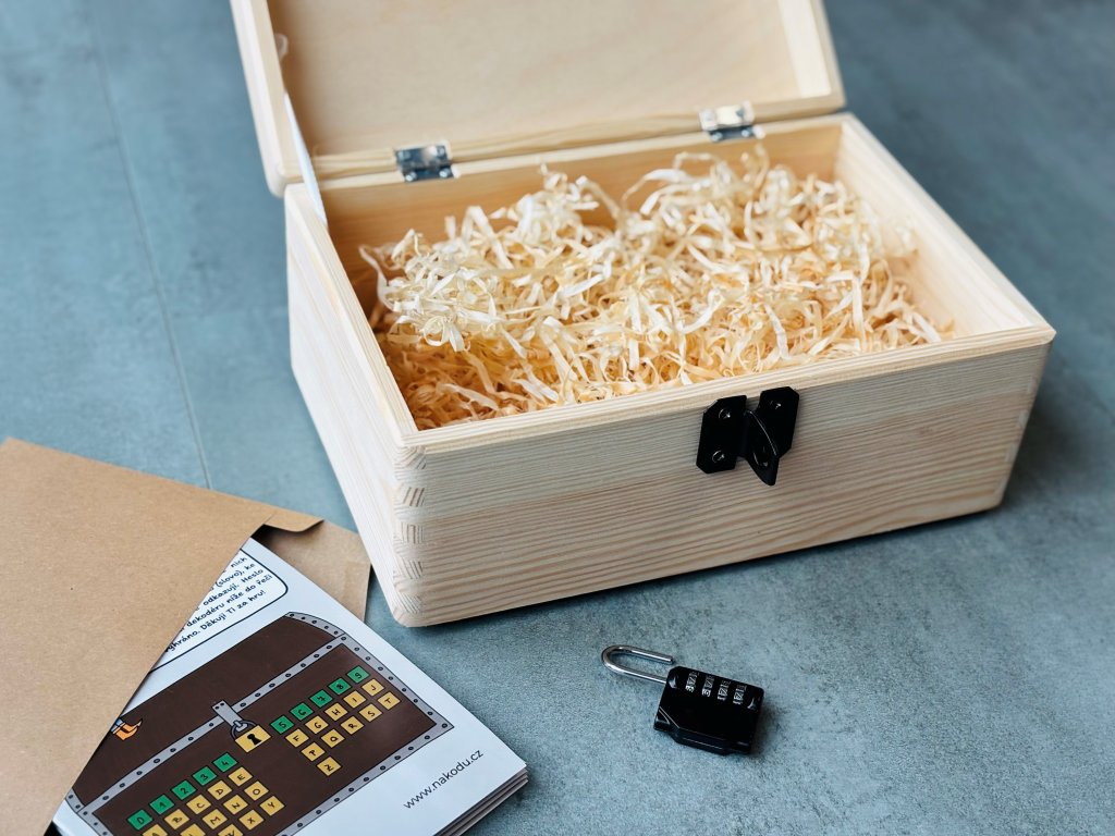 Máte vlastní dárek a hledáte zajímavý způsob jak ho předat? Truhla bez obsahu je skvělý způsob, jak někomu darovat například peníze, voucher nebo jiný vlastní dárek a zároveň při tom být originální a nevložit vše "jen do obálky". Se zašifrovanou truhlou máte jistotu, že bude Váš dárek jedinečný, zábavný a obdarovaného na pár desítek minut pořádně potrápí. Dostanete od nás krásnou truhlu se zámkem a uvnitř s přírodní dřevitou výplní, do které vložíte Váš dárek a uzamknete. V samostatné zapečetěné obálce zároveň dostanete naši šifru z ráje, kterou k truhle přiložíte. Jen Ti, kdo dokáží vyluštit sérii šifer a úkolů získají dostatek indicií aby nakonec odhalili potřebný kód a dokázali truhlu odemknout.